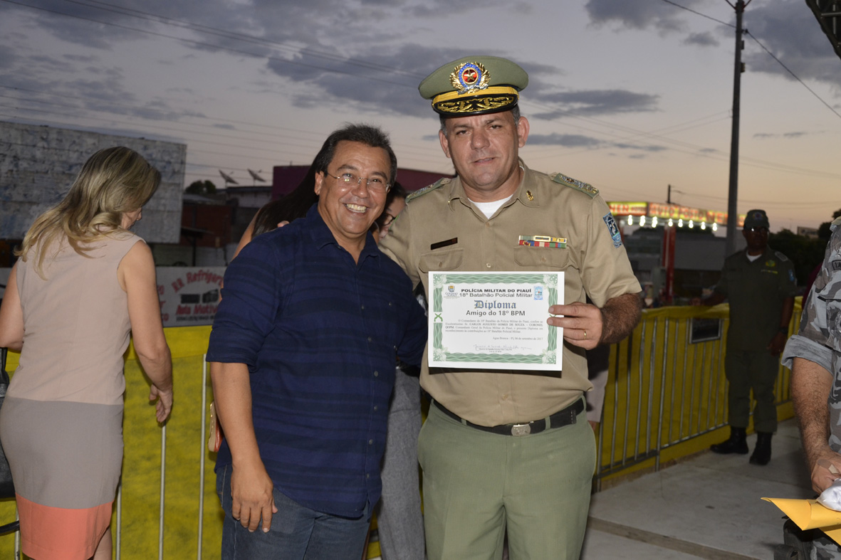 Na ocasião, foi entregue o certificado de Amigo do 18º Batalhão ao comandante Carlos Augusto Gomes de Sousa, pelo prefeito Jonas Moura. O vereador Dudu também recebeu o Certificado pelo comandante do 18º BPM de Água Branca, Major Lacerda.