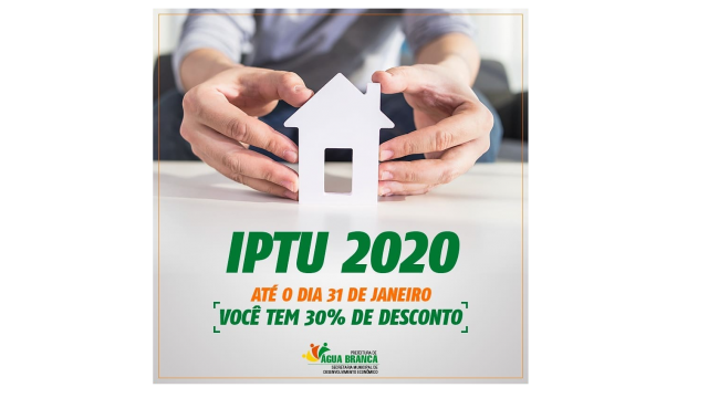 Os proprietários de imóveis em Água Branca que efetuarem o pagamento do Imposto sobre a Propriedade Predial e Territorial Urbana (IPTU), em cota única, até esta sexta-feira, dia 31 de janeiro, terão desconto de 30% sobre o valor total do tributo. A Prefeitura de Água Branca, através da Secretaria Municipal de Desenvolvimento Econômico (SMDE), já iniciou a entrega dos carnês e prorrogou o prazo para a concessão dos descontos.